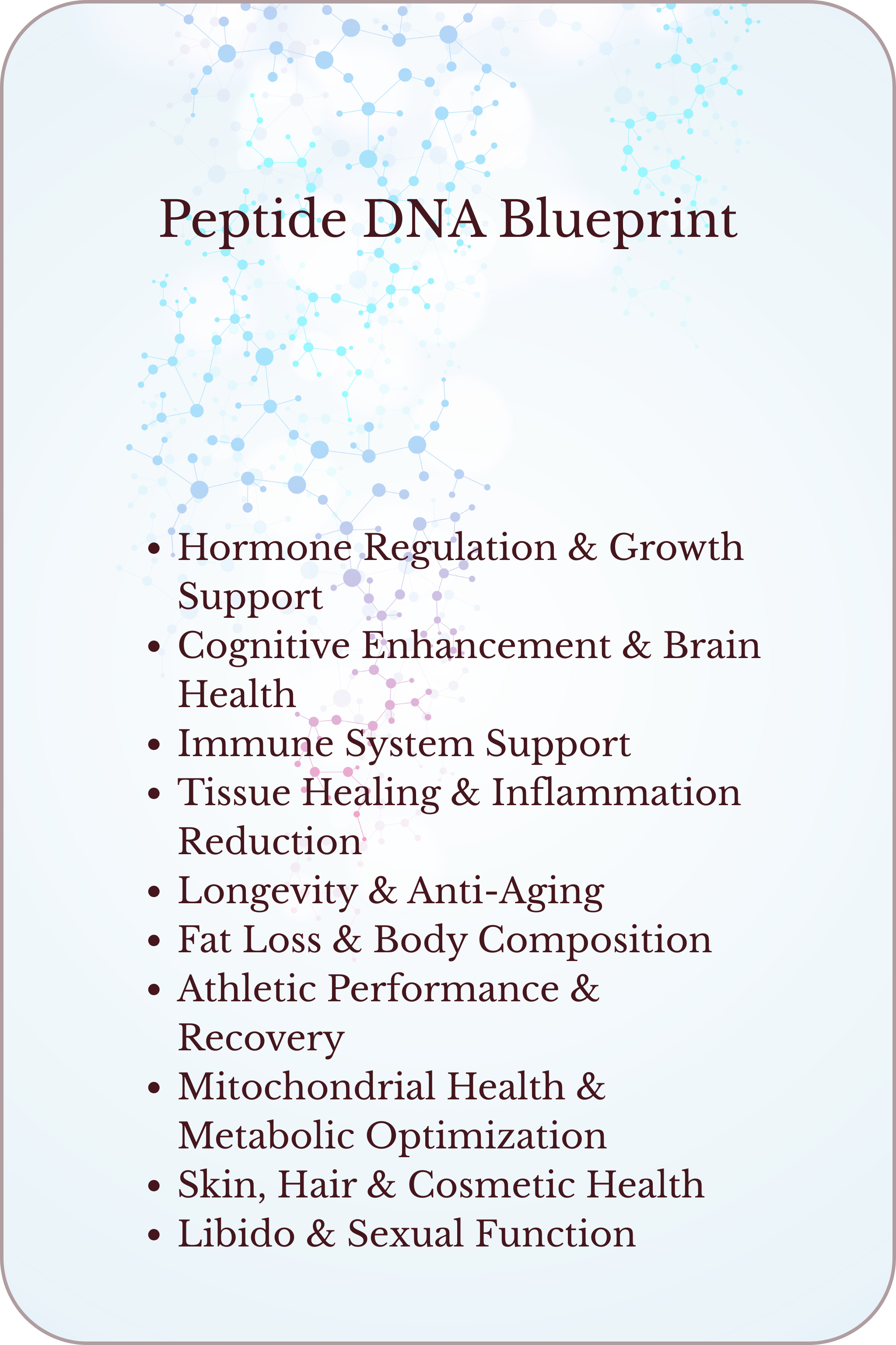 The Peptide DNA Test is the first tool that connects a patient’s genetic signals with the peptide pathways that may align best with their biology. Instead of generic protocols, the report highlights how their genes interact with key domains like cognitive health, immune support, tissue repair, metabolism, mitochondrial function, hormone balance, and more.